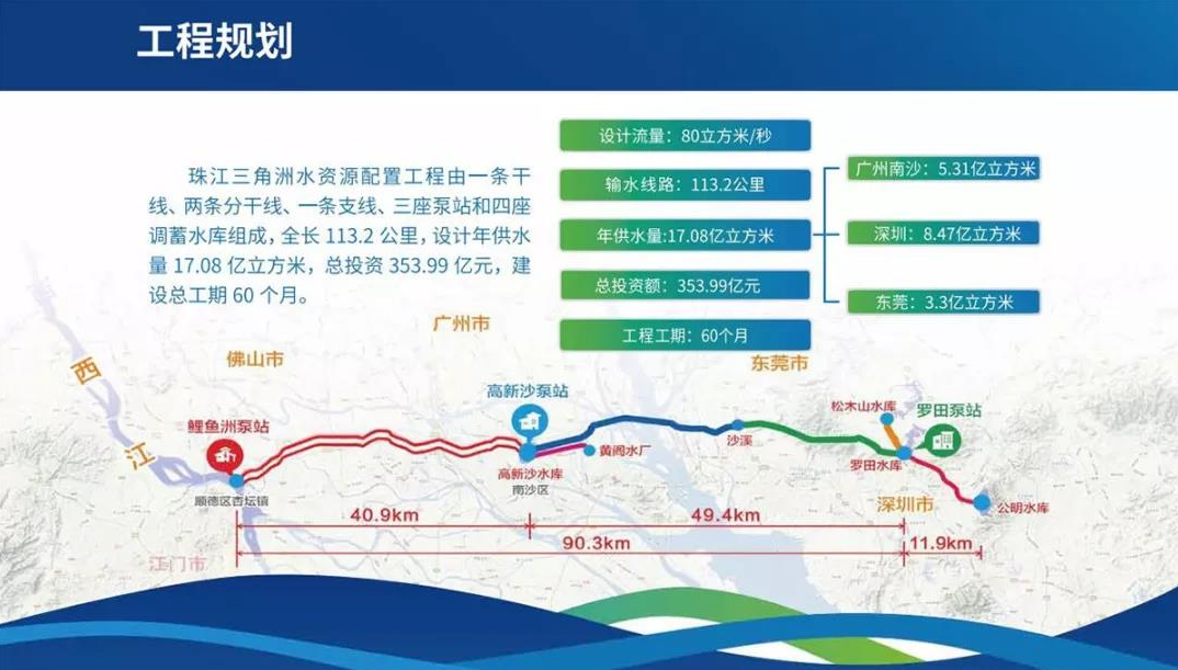 珠江三角洲水資源配置工程是黨中央、國(guó)務(wù)院部署的國(guó)家重大水利工程、工程輸水線路總長(zhǎng)113.1千米,計(jì)劃總投資約354億元。自2019年5月6日全面開工建設(shè)以來,歷時(shí)4年8個(gè)月基本完工,建成通水后實(shí)現(xiàn)從西江水系向珠三角東部引水,年供水量達(dá)17.08億立方米,是廣東已建成投資規(guī)模最大、輸水線路最長(zhǎng)、受水區(qū)域最廣的水資源配置工程。